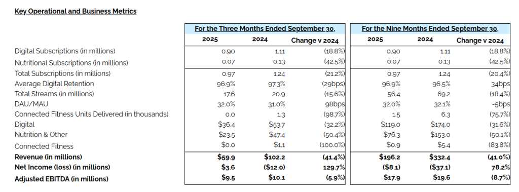 EL SEGUNDO, Calif.–(BUSINESS WIRE)– The Beachbody Company, Inc. (NASDAQ: BODi) (“BODi” or the “Company”), a leading fitness and nutrition company, today announced financial results for its third quarter ended September 30, 2025.