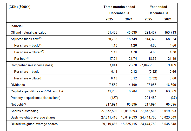 We executed our capital program under budget, generated meaningful adjusted funds flow, returned $27.1 million to shareholders and paid down $35 million of net debt from closing of the Pembina acquisition on April 7, 2025. Production averaged 17,043 boe/d(1) (61% light crude oil & NGLs) in 2025 and 19,589 boe/d (61% light crude oil & NGLs) in the fourth quarter of 2025.