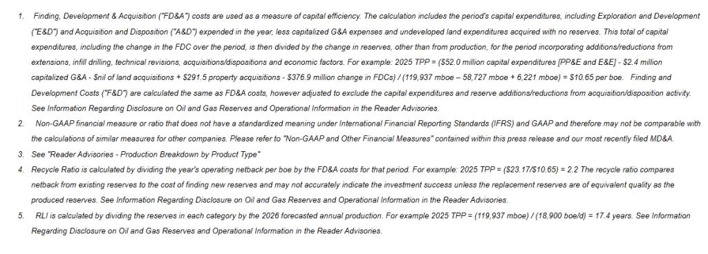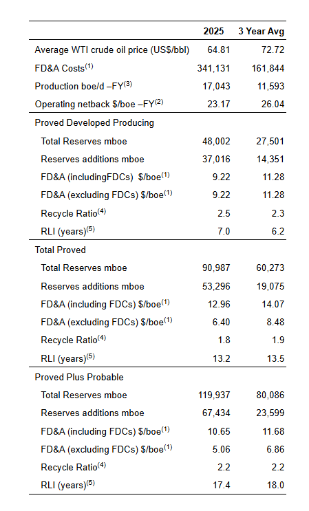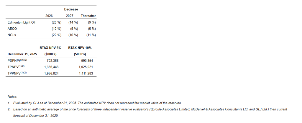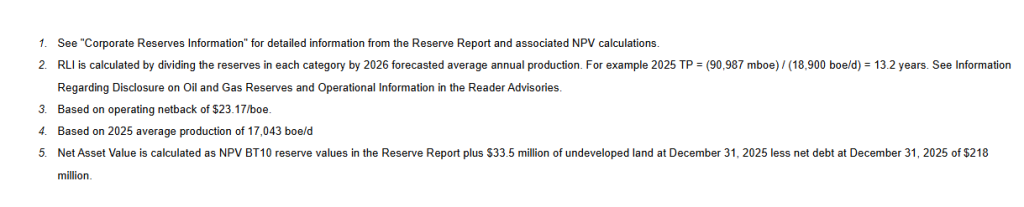 The Company’s exceptional 2025 reserve results reflect both the impact of the acquisition and strong operating results achieved during the year. Proved Developed Producing (“PDP”) reserves increased 179%, while a long reserve life index continues to underpin a low decline, high FAFF generating asset base. Despite a material year-over-year decrease in the benchmark Edmonton light oil price used in the Reserve Report (20% in 2026, 14% in 2027, 9% thereafter), the Company increased its Total Proved (“TP”) and Total Proved plus Probable (“TPP”) net asset value to $30.16/share and $44.02/share respectively, underscoring the significant intrinsic value embedded in our assets relative to current market levels.