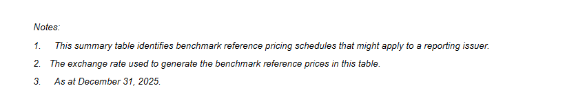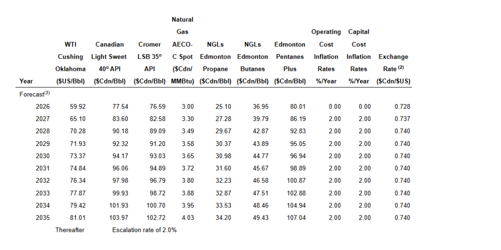 The following tables set forth the benchmark reference prices, as at December 31, 2025, reflected in the Reserve Report. These price and cost assumptions were an arithmetic average of the price forecasts of three independent reserve evaluator’s (Sproule, McDaniel & Associates Consultants Ltd. and GLJ Ltd.) then current forecast and GLJ’s foreign exchange rate forecast at the effective date of the Reserve Report.