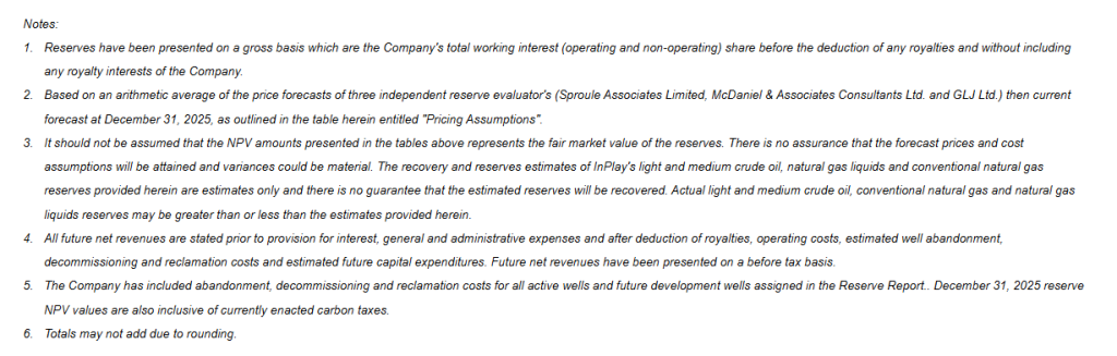InPlay achieved strong before tax estimated net present values (“NPV”) of future net revenues associated with our 2025 year-end reserves discounted at 10% (“NPV BT10”), although impacted by weaker future commodity prices in comparison to December 31, 2024 (refer to table below). The Company achieved NPV BT10 reserve values of $594 million (PDP), $1,025 million (TP) and $1,411 million (TPP) based on the three independent reserve evaluator average pricing, cost forecast and foreign exchange rates as at December 31, 2025 used in the Reserve Report. Commodity price decreases in the 2025 year-end reserve report compared to 2024 were as follows:
